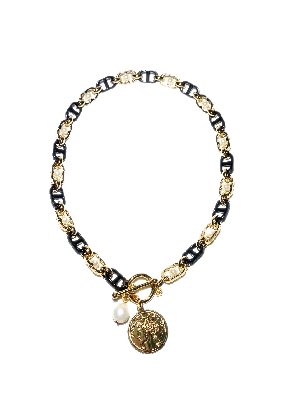 A metal chain necklace with a shell pearl and a coin.